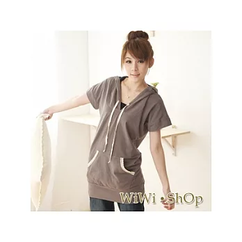 [WiWiShOp]蕾 絲中口袋領口圓弧車線長版抽繩連帽T~鐵灰